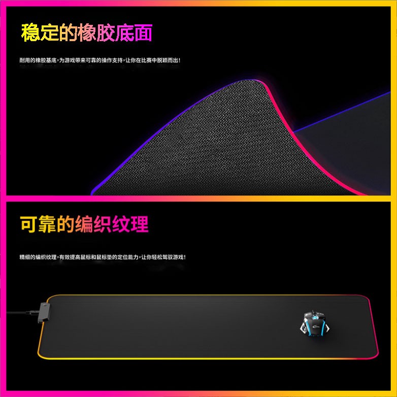 炫彩RGB游戲鼠標墊,織物面料編織,表面細膩、平整、操作穩定,帶燈光切換按鍵,輕輕一按,燈光可自由切換,加厚橡膠底部,穩固防滑