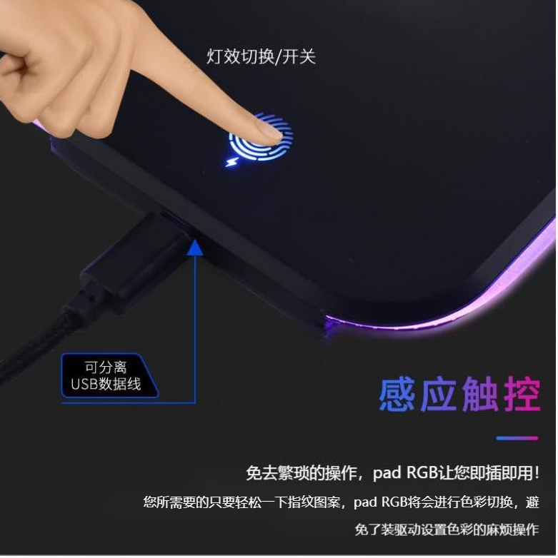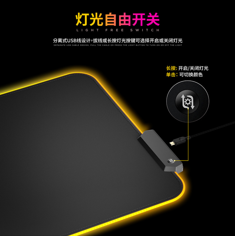 炫彩RGB游戲鼠標墊,織物面料編織,表面細膩、平整、操作穩定,帶燈光切換按鍵,輕輕一按,燈光可自由切換,加厚橡膠底部,穩固防滑